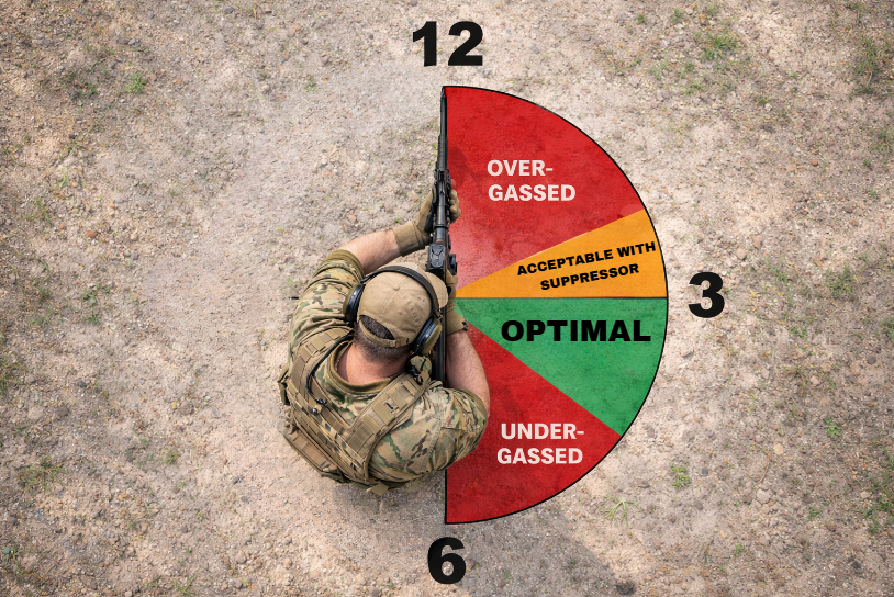 Ejection patterns should be approximately 3-4 o'clock. If you observe your casings ejecting closer to 1 o'clock (over-gassed), go UP in vent screw size to CLOSE gas block. If ejecting closer to 5 o'clock (under-gassed), go DOWN in vent screw size to OPEN gas block.